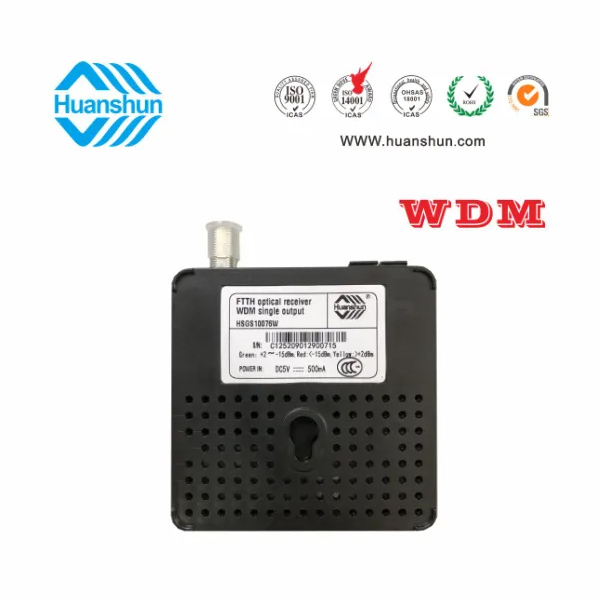 WDM型單輸出FTTH光接收機(jī) | HSGS10076W | CATV 1540~1565nm接收,-5~-15dBm/RF 76dBuv恒流輸出,PON:1490/1310nm;外接90~255V 5V 0.5A電源適配器 |